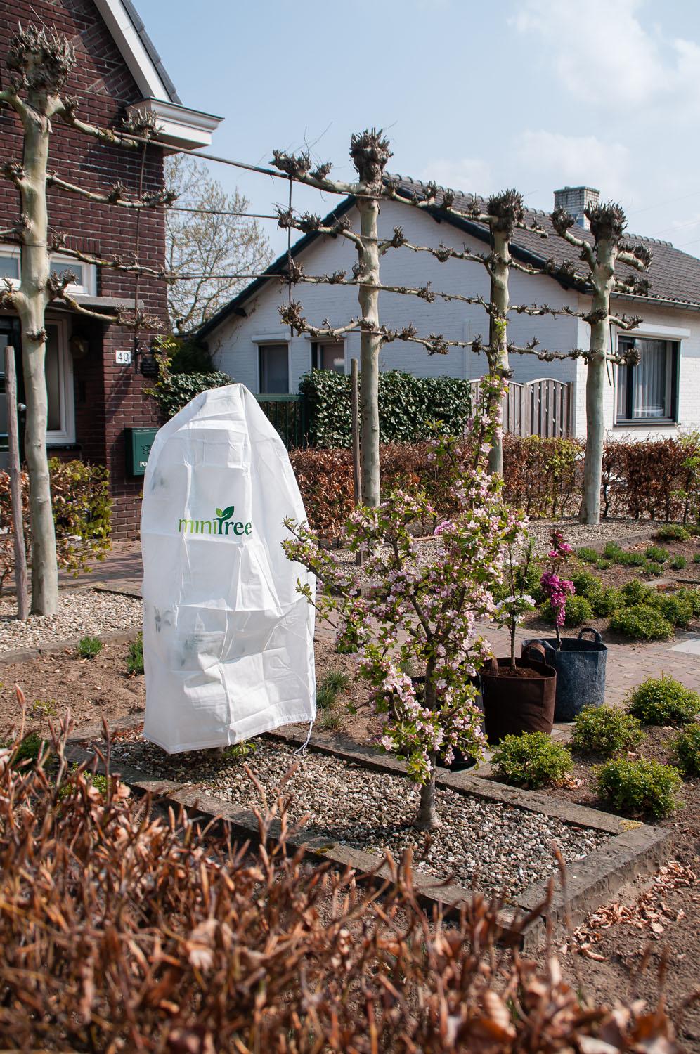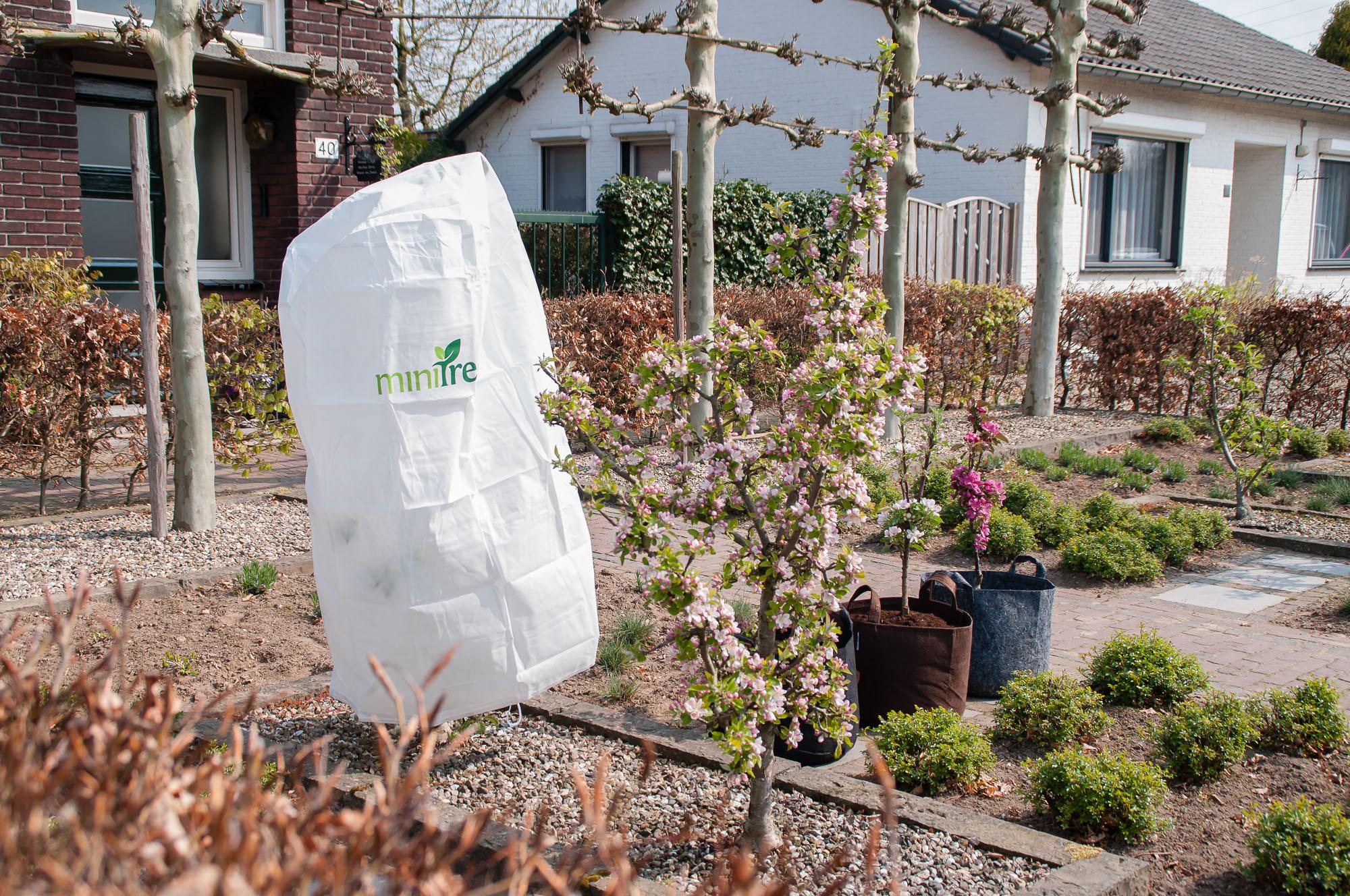 Een bloesembeschermer beschermt de bloesem van je MiniTree tegen nachtvorst in de maanden april en mei. Dit is van belang, want als de bloesem bevriest, groeien er in dat jaar geen appels aan je MiniTree. De bloesembeschermer is voorzien van een handig trekkoord, waarmee je de MiniTree snel kan inpakken en de beschermer veilig rond de stam van de MiniTree of gehele pot vast kunt maken.