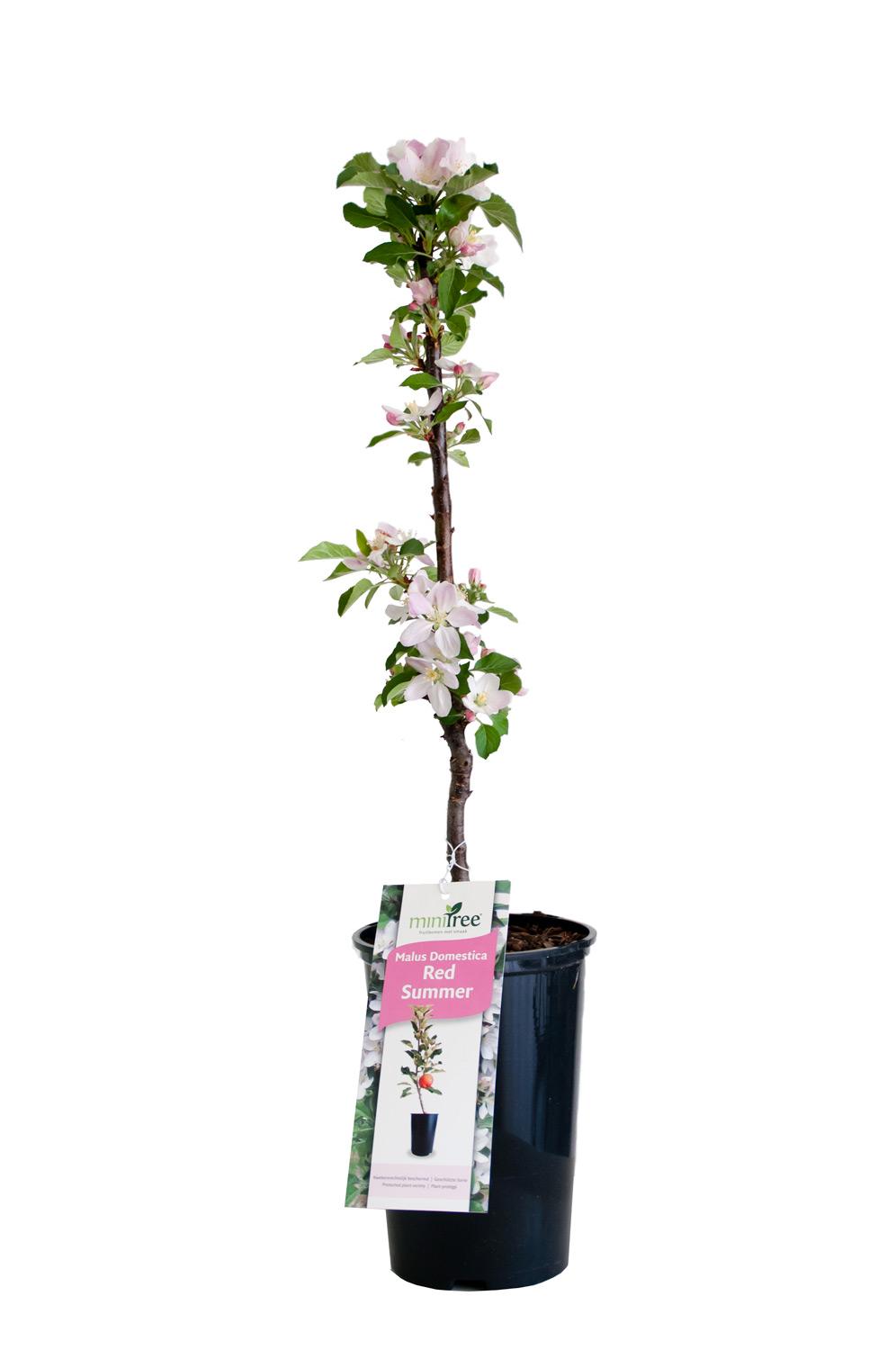 MiniTree Red Summer is een kleine appelboom die heel geschikt is voor in de tuin of op het balkon. Red Summer laat je in het voorjaar genieten van mooie lichtroze bloesem en in het najaar van sappige, zoete en egaalrode handappels (vergelijkbaar met de Kanzi). Het onderhoud aan deze appelboom is minimaal en snoeien en spuiten tegen ziektes is niet nodig.